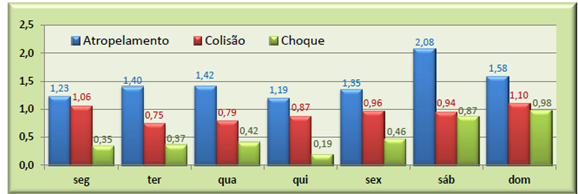 Outro fato que chama a atenção na ocorrência das mortes de pedestre é o fator velocidade veicular tanto a regulamentada como a praticada. Isto fica evidente ao se constatar que os dias da semana de maior ocorrência de atropelamentos fatais são o sábado e o domingo, quando o fluxo veicular mais reduzido permite que os veículos circulem em velocidade mais alta.