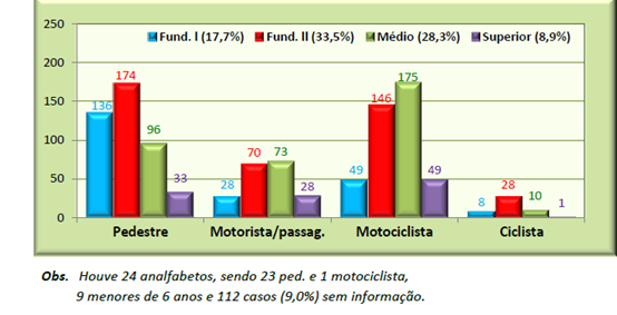 A escolaridade das vítimas fatais de atropelamentos se situa nos níveis preliminares na maioria (51,2%) entre o Fundamental I e Fundamental II, 30% com ensino médio completo e nem 10% com ensino superior. Conforme ocorre com a faixa etária esta situação mais uma vez reproduz também o perfil do Modo a Pé obtido na Pesquisa OD do Metrô.
