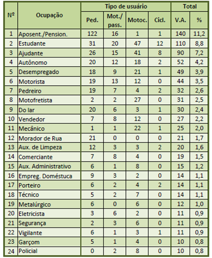 A ocupação das vítimas de atropelamentos é decorrência de seu perfil sócio econômico, expondo como maior vítima justamente os mais vulneráveis, aposentados e pensionistas, 11,2% do total, onde pesa a faixa etária e limitações físicas impostas a esta condição. Se retornarmos à planilha que expõe a faixa etária dos pedestres, verificaremos que o perfil da vítima não corresponde a ele mas sim à categoria que vem a seguir que são os estudantes perfazendo 8,8% .