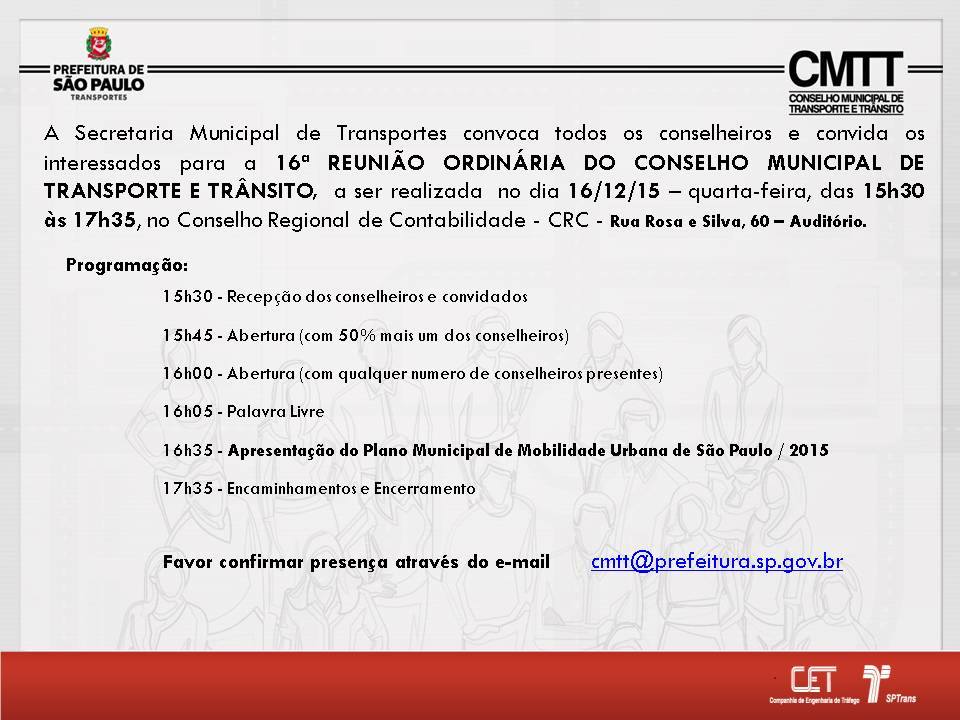 A Secretaria Municipal de Transportes convoca todos os conselheiros e convida os interessados para a 16ª REUNIÃO ORDINÁRIA DO CONSELHO MUNICIPAL DE TRANSPORTE E TRÂNSITO, a ser realizada no dia 16/12/15 – quarta-feira, das 15h30 às 17h35,Conselho Regional de Contabilidade – CRC – Rua Rosa Silva,60 – Auditório