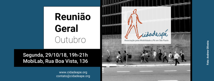 Todas e todos estão convidados a participar da 43ª Reunião Geral da Cidadeapé, segunda-feira, 29/10/18, às 19h00, no Mobilab (Rua Boa Vista, 136, Mezanino), próximo ao Metrô São Bento.