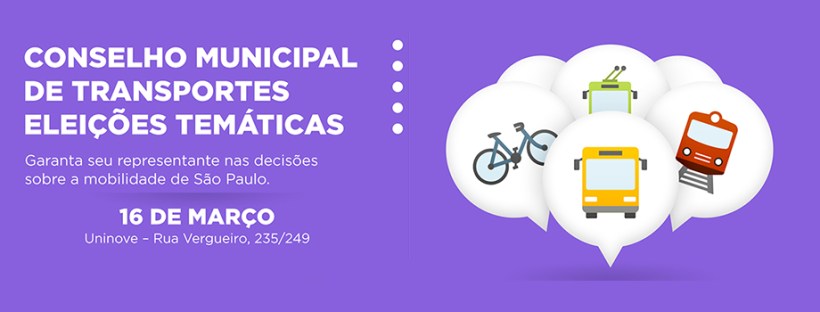 Este sábado, 16/3, teremos eleições temáticas para o Conselho Municipal de Transporte e Trânsito – CMTT. (No dia 30 serão as eleições regionais, veja mais detalhes aqui).