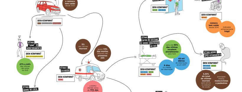 Um trabalho digno de detetive. Acompanhar dados de vítimas do trânsito e como se relacionam ao sistema de saúde não é tão simples quanto parece. Temos muitas fontes, com graus distintos de abrangência e confiabilidade. As bases, porém, cobrem momentos específicos e muitas vezes não se conversam, evidenciando que não temos informações sobre um grande número de vítimas. Ainda assim, olhá-las forma um panorama geral interessante e nos dá indícios sobre o que está acontecendo nos diferentes momentos após as ocorrências, algo que pode ser resumido da seguinte forma: