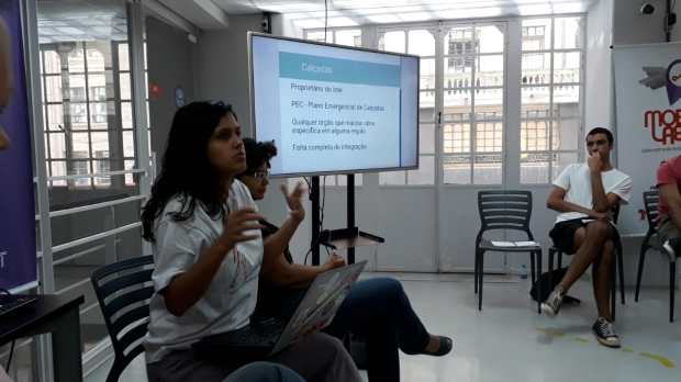 Na segunda parte do encontro, as pessoas participantes se dividiram entre duas atividades: um treinamento de mídia para associadas e um treinamento sobre os princípios da mobilidade a pé para quem tivesse interesse em se aprofundar sobre o tema.