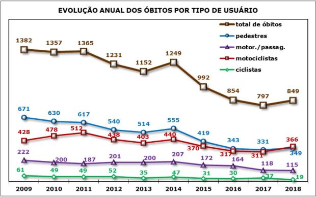 A Prefeitura de São Paulo divulgou hoje o Relatório de Mortes no Trânsito do ano de 2018, produzido pela Companhia de Engenharia de Tráfego (CET). É com muito pesar que confirmamos que, contrariando a tendência dos quatro anos anteriores, as mortes no trânsito voltaram a subir na cidade de São Paulo. Em 2017, a CET contabilizou 797 mortes decorrentes de ocorrências de trânsito, das quais 331 foram atropelamentos fatais de pessoas que estavam a pé e 37, de bicicleta. Já em 2018, 849 pessoas perderam a vida no trânsito paulistano, das quais 349 estavam a pé e 19 de bicicleta. Isso representa um aumento de 6,5% no total de mortes e 5,4% nas mortes de pedestres.