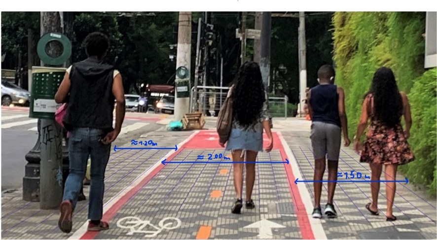 Se considerarmos os 1,50m de faixa livre mínima útil verificada no local (nas proximidades da esquina com a Rua Xavier de Toledo) e o item do Plano Cicloviário de 2020 que diz que “…a implantação de ciclofaixa … partilhada com pedestre só deve ser permitida quando… a largura destinada à circulação exclusiva de pedestre atende ao fluxo verificado no local … com volume de pedestres inferior a 160 pedestres/hora/metro…” a capacidade dessa faixa livre resultaria em 240 pedestres por hora, valor significativamente inferior aos 447 pedestres por hora pico contabilizados pela CET no local. (Esse valor nos foi informado na última reunião da Câmara Temática de Mobilidade a Pé do Conselho Municipal de Transporte e Trânsito – CMTT). Para atender esse valor contabilizado, a faixa livre de circulação deveria ter um mínimo de 2,80m (fora o afastamento lateral de paredes).