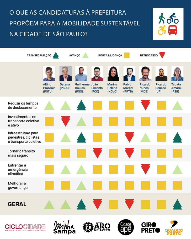 Analisamos os programas de governo registrados pelas candidatas e candidatos no site do Tribunal Superior Eleitoral*, suas entrevistas e sabatinas, e procuramos o que está sendo proposto para garantir o direito à mobilidade a toda a população paulistana. Usando como parâmetro os objetivos e as ações apresentadas na nossa Carta-compromisso com a Mobilidade Sustentável, mostramos nesse infográfico quem traz propostas transformadoras, avanços importantes, propostas incipientes que trariam pouca mudança ou até mesmo, retrocessos.