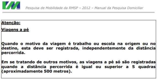 . Secretaria dos Transportes Metropolitanos. Pesquisa de Mobilidade 2012 Manual da                      Pesquisa                        Domiciliar,                2012.                Disponível                em:  <http://www.metro.sp.gov.br/metro/arquivos/mobilidade- 2012/manuais/manual%20domiciliar_2012.pdf>.