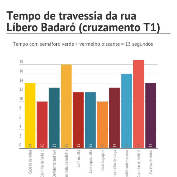 A região possui grande fluxo de pedestres, incluindo funcionários da prefeitura de São Paulo, localizada logo em frente ao cruzamento (prédio com heliponto azul na foto acima). Além disso, o local possui um dos nove semáforos para deficientes visuais da cidade. A atividade foi realizada entre 13h e 14h e todos os voluntários que atravessaram o cruzamento esperaram na calçada para atravessar durante a abertura do sinal para pedestres. Abaixo você confere o tempo que cada um dos representantes das pessoas com mobilidade reduzida levou para cruzar a Líbero Badaró (T1).