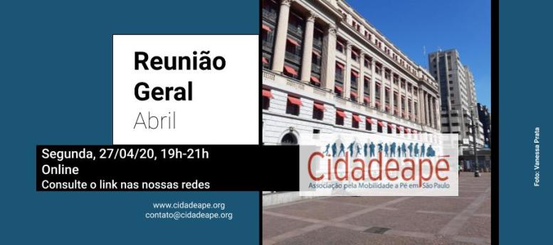 Todas e todos estão convidados a participar da 82ª Reunião Geral da Cidadeapé. Nossa reunião acontecerá em formato híbrido – online e presencial. Confira os endereços digital e físico abaixo. Venha contribuir para uma cidade mais caminhável! Participe. PAUTA DA 82ª REUNIÃO GERAL Boas-vindas aos novos participantes Atualizações CTMP e CMTT Planejamento 2022 – próximos … Continue lendo ABRIL 2022