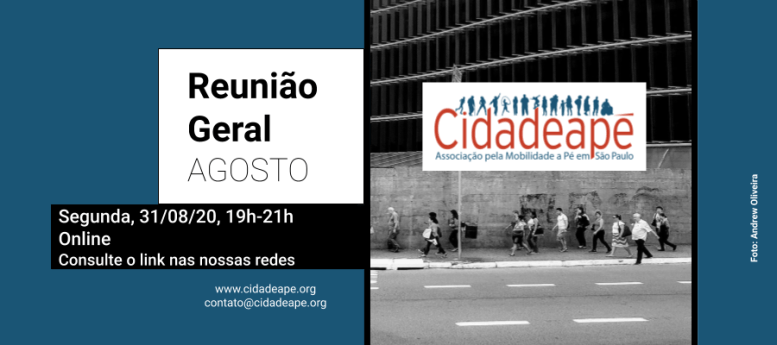 Todas e todos estão convidados a participar da 62ª Reunião Geral da Cidadeapé. Dia: Segunda-feira, 27/07/20 Hora: Das 19h00 às 21h00. Local: ONLINE LINK: meet.google.com/pzk-qmbs-mbc As atas das reuniões anteriores estão disponíveis na página de Transparência do nosso site. Venha contribuir para uma cidade mais caminhável! Participe. PAUTA DA 62ª REUNIÃO GERAL Boas-vindas aos novos … Continue lendo Julho de 2020