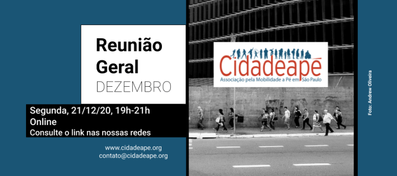 Todas e todos estão convidados a participar da 78ª Reunião Geral da Cidadeapé. Às 19h daremos início à nossa Reunião Geral no 11o. andar, salas 1 e 2 de reunião. Em seguida, às 20h, faremos uma pequena comemoração no terraço no 15o. andar. Venha contribuir para uma cidade mais caminhável! Participe. PAUTA DA 78ª REUNIÃO GERAL … Continue lendo Dezembro 2021