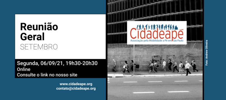 Todas e todos estão convidados a participar da 64ª Reunião Geral da Cidadeapé. Dia: Segunda-feira, 28/09/20Hora: Das 19h00 às 21h00.Local: ONLINELINK: http://meet.google.com/tph-mrfs-zhf As atas das reuniões anteriores estão disponíveis na página de Transparência do nosso site. Venha contribuir para uma cidade mais caminhável! Participe. PAUTA DA 64ª REUNIÃO GERAL Boas-vindas aos novos participantes Atualizações Grupos … Continue lendo Setembro 2020