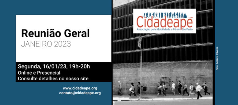 Todas e todos estão convidados a participar da 91ª Reunião Geral da Cidadeapé. Nossa reunião acontecerá em formato híbrido – online e presencial. Confira os endereços digital e físico abaixo. Venha contribuir para uma cidade mais caminhável! Participe. PAUTA DA 91ª REUNIÃO GERAL Lembramos que a reunião é aberta a quem quiser conhecer quem faz … Continue lendo Janeiro 2023