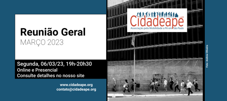 Todas e todos estão convidados a participar da 93ª Reunião Geral da Cidadeapé. Nossa reunião acontecerá em formato híbrido – online e presencial. Confira os endereços digital e físico abaixo. Venha contribuir para uma cidade mais caminhável! Participe. PAUTA DA 93ª REUNIÃO GERAL Lembramos que a reunião é aberta a quem quiser conhecer quem faz … Continue lendo Março 2023