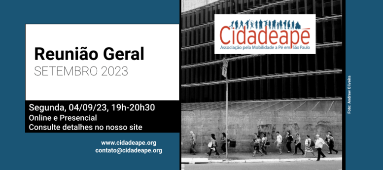 Todas e todos estão convidados a participar da 101ª Reunião Geral da Cidadeapé. Nossa reunião acontecerá em formato híbrido – online e presencial. Confira os endereços digital e físico abaixo. Venha contribuir para uma cidade mais caminhável! Participe. PAUTA DA 101ª REUNIÃO GERAL Lembramos que a reunião é aberta a quem quiser conhecer quem faz … Continue lendo NOVEMBRO 2023